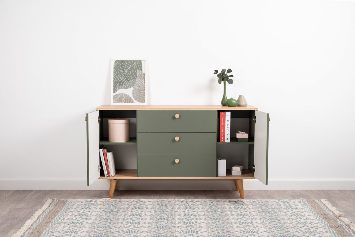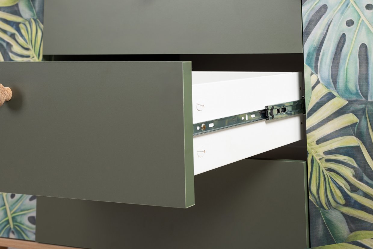 Маттиас – яркий комод с фотопечатью в тропическом стиле. Деревянные ручки и опоры подчеркивают естественность дизайна, а шариковые направляющие полного выдвижения и петли с доводчиком обеспечивают плавность и удобство эксплуатации.