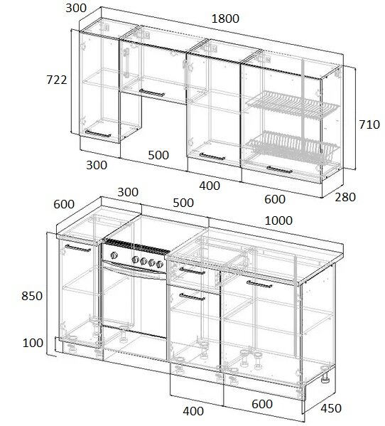 - Фасады верхних модулей со свесом – дают возможность использовать модули без установки ручек, а также установить скрытую подсветку;