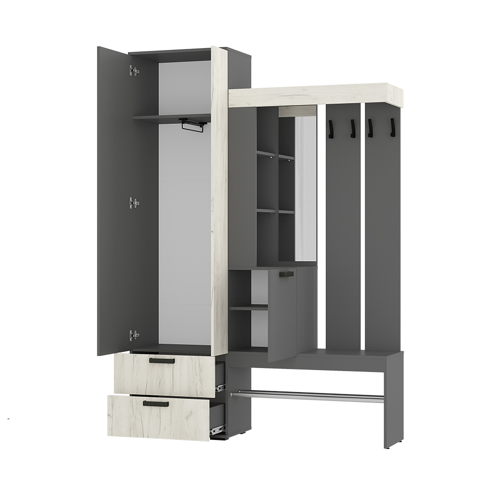 Изящная и практичная конструкция. Вместительный и компактный шкаф с отделением для верхней одежды и выдвижными ящиками. Удобная подставка под обувь (металлическая труба). Эргономичная основная секция с крючками для одежды, полками для мелочей, зеркалом и одним закрытым отделением. Контрастное исполнение в трендовых оттенках.