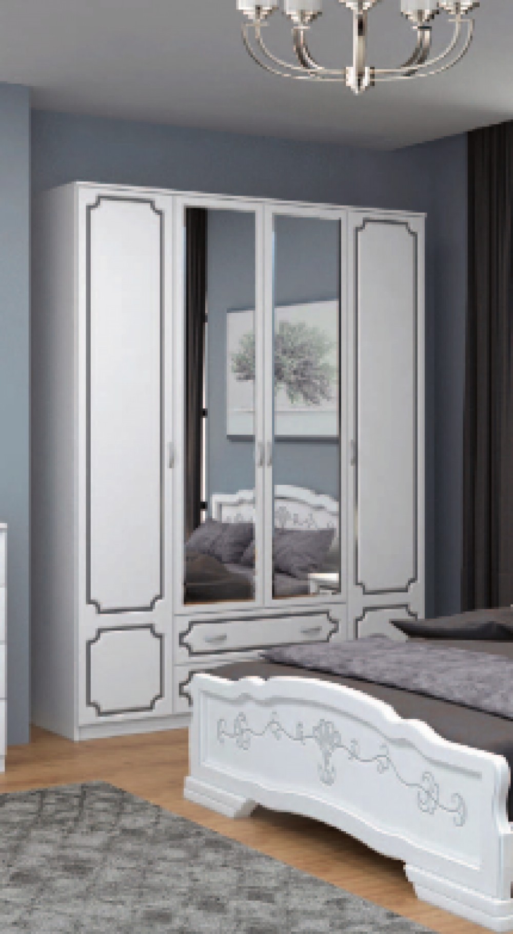 Белоснежность фасадов, элегантная отделка рисунком, классический распашной шкаф с зеркалом - так выглядит идеальная спальня. нежный оттенок белого жемчуга делает комнату более просторной и светлой - универсальный вариант для любого стиля.